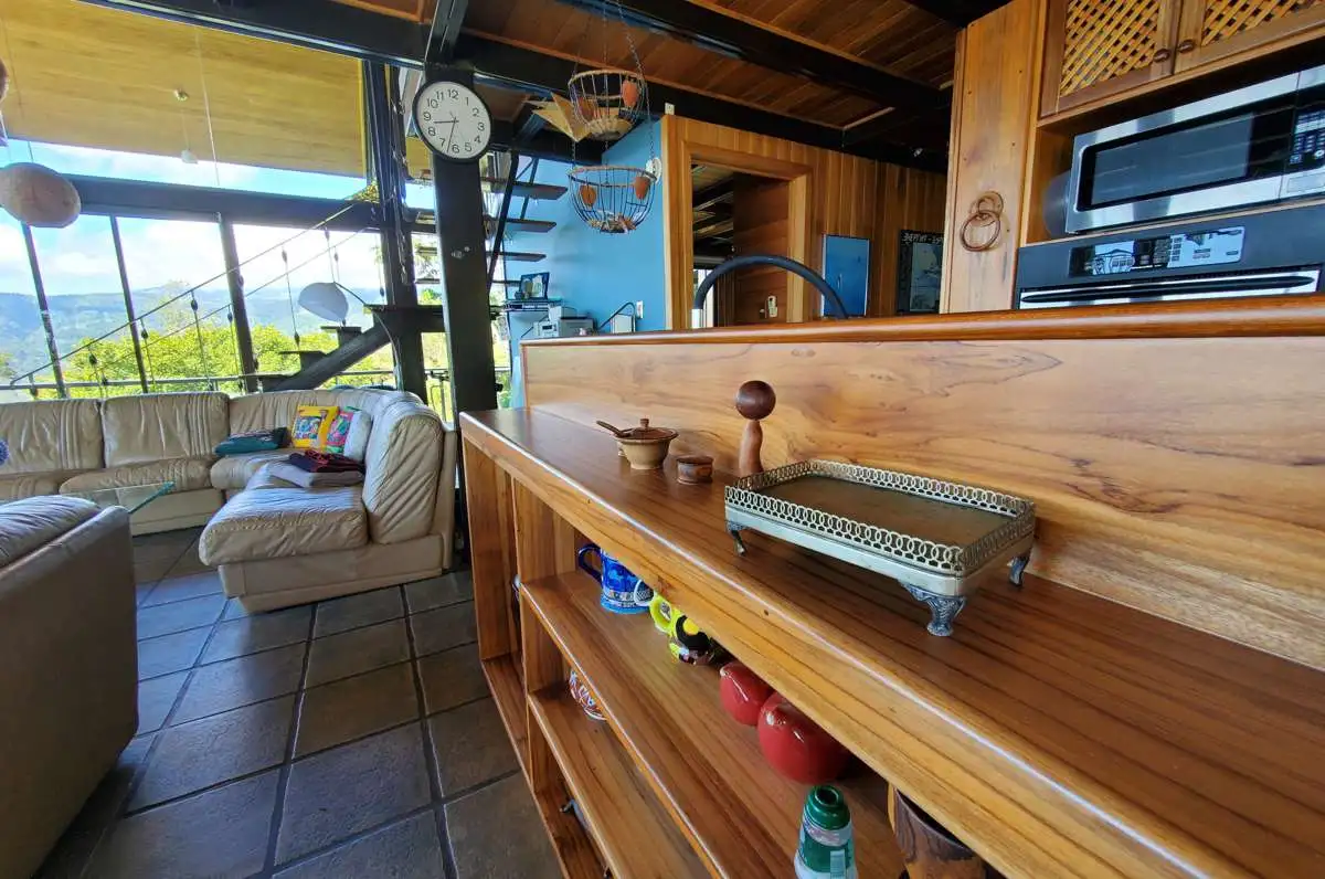 The dining table seats 8 comfortably. It's easy to serve from the kitchen